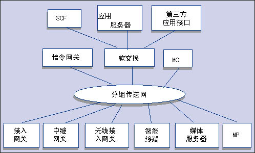 接入層包括各種接入網(wǎng)關、中繼網(wǎng)關、無線接入網(wǎng)關、智能終端以及與處理媒體有關的媒體服務器和多點處理器(MP)。傳送層包括提供IP包轉發(fā)的各種承載網(wǎng)功能實體。控制層是NGN網(wǎng)絡的核心,主要包括軟交換設備、信令網(wǎng)關和多點處理器。業(yè)務層則主要包括應用服務器、第三方應用接口和傳統(tǒng)智能網(wǎng)功能。該業(yè)務層通過開放的業(yè)務層接口向用戶提供傳統(tǒng)智能網(wǎng)業(yè)務、多樣化的第三方業(yè)務和增值業(yè)務。