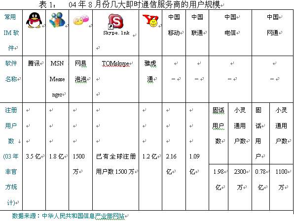 11月16日,TOM在線和歐洲行業(yè)巨頭Skype在京聯(lián)手推出聊天工具TOM-Skype,此業(yè)務(wù)的出現(xiàn),立即在即時(shí)通信市場(chǎng)上掀起了軒然大波。其清晰的話音質(zhì)量,簡(jiǎn)潔方便的操作界面,擁有來自165個(gè)國(guó)家1500多萬的全球用戶,在極短的時(shí)間內(nèi)就吸引到了大量的中國(guó)用戶,更讓基礎(chǔ)運(yùn)營(yíng)商感到不安的是skype強(qiáng)大的語音聊天功能將可能大大改變傳統(tǒng)電信的使用習(xí)慣;而與此同時(shí),現(xiàn)有的QQ,POPO等國(guó)內(nèi)即時(shí)通信工具也早已開展了語音聊天功能,只是苦于目前話音質(zhì)量不盡理想而已。面對(duì)眾多虛擬運(yùn)營(yíng)商現(xiàn)實(shí)和潛在威脅,幾大基礎(chǔ)運(yùn)營(yíng)商選擇先下手為強(qiáng),進(jìn)入“即時(shí)通信”市場(chǎng)的戰(zhàn)略也就不足為怪了。