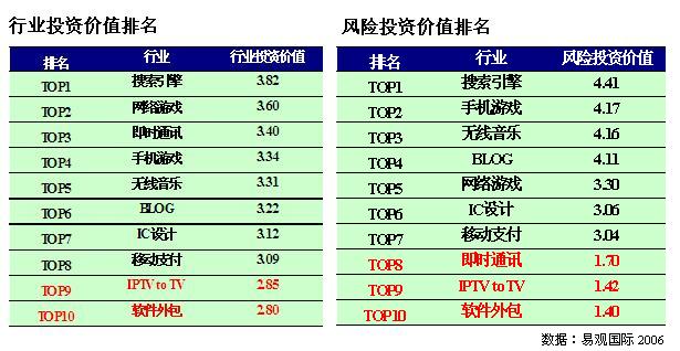 3G 牌照的發(fā)放,手機(jī)游戲、無(wú)線音樂、移動(dòng)支付、博客等行業(yè)投資潛力都將有所提高,其中手機(jī)游戲、無(wú)線音樂和博客分別列居第二、第三、第四,成為未來(lái)三年中高增長(zhǎng)行業(yè)。即時(shí)通訊行業(yè)投資價(jià)值排名第三,由于其商業(yè)模式的低創(chuàng)新,致使其風(fēng)險(xiǎn)投資價(jià)值僅為倒數(shù)第三,不具備風(fēng)險(xiǎn)投資價(jià)值。隨著汽車行業(yè)、消費(fèi)電子行業(yè)逐步向智能化、數(shù)字化發(fā)展,IC