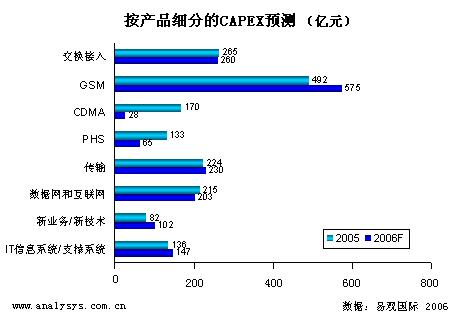易觀國(guó)際預(yù)測(cè)2006年全國(guó)電信運(yùn)營(yíng)商的資本總開(kāi)支為2053億(不包括 3G 資本開(kāi)支),比2005年下降1%?偟目磥(lái),運(yùn)營(yíng)商在