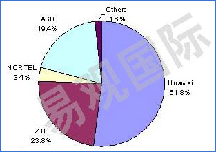 從1997年首次提出NGN概念后,經(jīng)過長達(dá)數(shù)年的孕育和完善,全球于2004年進(jìn)入商用部署階段,目前NGN業(yè)務(wù)在全球各地都有廣泛和大規(guī)模的商用。而中國的運(yùn)營商也經(jīng)歷了小規(guī)模試驗(yàn)和測試、大規(guī)模測試和試商用、大規(guī)模商用這幾個(gè)階段。圖:中國NGN市場各設(shè)備廠商市場份額