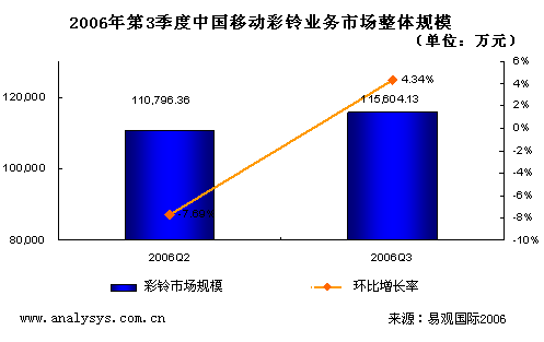 研究表明,2006年第3季度,CRBT業(yè)務(wù)略有反彈。其中移動(dòng)彩鈴業(yè)務(wù)的分帳前信息費(fèi)接近16000萬元,較上個(gè)季度小幅度反彈2.6%。但是總體上仍然呈現(xiàn)徘徊態(tài)勢,并沒有走出低級飽和區(qū)。易觀網(wǎng)