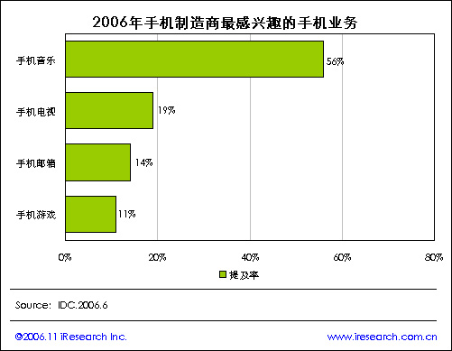 iResearch艾瑞市場咨詢根據(jù)IDC統(tǒng)計數(shù)據(jù)顯示,2006年手機(jī)制造商最感興趣的手機(jī)業(yè)務(wù)情況,手機(jī)音樂是手機(jī)制造商最感興趣的業(yè)務(wù),提及率達(dá)到56%,然后依次是手機(jī)電視19%、手機(jī)郵箱14%以及手機(jī)游戲11%.艾瑞市場咨詢