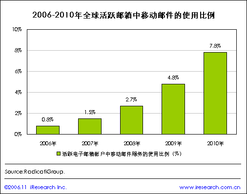 iResearch艾瑞市場咨詢根據(jù)市場咨詢公司RadicatiGroup公布的調查結果整理顯示,在2006年全球活躍電子郵箱賬號中有0.8%使用移動電子郵件服務,移動電郵將會逐漸為高端用戶所接受,RadicatiGroup預計到2010年活躍電子郵箱賬號中使用移動電郵服務的比例將達到7.8%.艾瑞市場咨詢