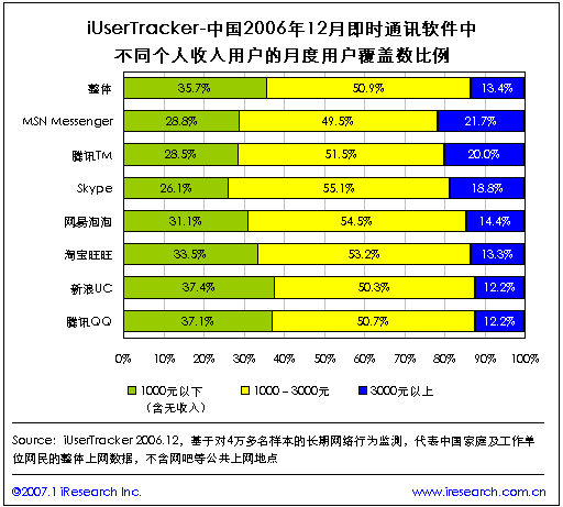根據(jù)iResearch艾瑞市場(chǎng)咨詢最新推出的網(wǎng)民連續(xù)用戶行為研究系統(tǒng)iUserTracker的最新數(shù)據(jù)表示,2006年12月,即時(shí)通訊軟件的月度總覆蓋用戶數(shù)為10183萬(wàn)人,比2006年11月上升了0.8%,其中使用騰訊QQ的用戶最多,占94%,MSN Messenger排名第二,占35.6%,淘寶旺旺排名第三,占29%。在最近四個(gè)月內(nèi),即時(shí)通訊類軟件的月度總覆蓋用戶數(shù)總體保持增長(zhǎng)。艾瑞市場(chǎng)咨詢(iresearch)