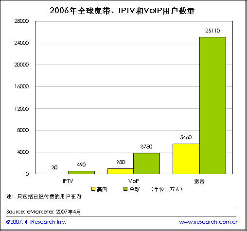 iResearch艾瑞市場(chǎng)咨詢根據(jù)eMarketer最新的數(shù)據(jù)發(fā)現(xiàn),寬帶上網(wǎng)環(huán)境為一些列的寬帶平臺(tái)應(yīng)用產(chǎn)品創(chuàng)造了良好的使用環(huán)境,各種服務(wù)同步發(fā)展起來。隨著全球?qū)拵в脩魯?shù)量的逐漸增加,全球IPTV和VoIP用戶也迅速成長(zhǎng)。到2006年全球?qū)拵в脩暨_(dá)到2.511億人,VoIP和IPTV的全球用戶數(shù)量也分別達(dá)到了3780萬人和490萬人。艾瑞市場(chǎng)咨詢