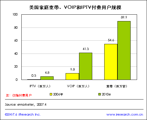 iResearch艾瑞市場咨詢公司根據(jù)eMarketer發(fā)布的數(shù)據(jù)整理顯示,2006年美國IPTV付費(fèi)用戶規(guī)模達(dá)到30萬人,該公司預(yù)測到2010年將達(dá)到480萬人。2006年美國VOIP付費(fèi)用戶規(guī)模達(dá)到980萬人,預(yù)計到2010 年將達(dá)到4130萬人。2006年美國家庭寬帶付費(fèi)規(guī)模達(dá)到5460萬家,預(yù)計到2010年達(dá)到8990萬家。艾瑞市場咨詢
