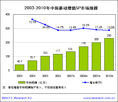 iResearch艾瑞市場咨詢研究成果《2007年移動增值研究報告》顯示,2006年中國移動增值SP市場規(guī)模達到117億元,比2005年增長14.7%,近兩年移動增值SP市場受政策因素影響增長相對平緩,但隨著市場環(huán)境的成熟,3G商用和2008年奧運都將對SP移動增值市場有所推進,預計未來幾年中國移動增值市場又會迎來一個新的發(fā)展高潮,艾瑞研究預測到2008年移動增值SP市場規(guī)模將達到170億元,預計未來四年中國移動增值市場規(guī)模將持續(xù)增長。