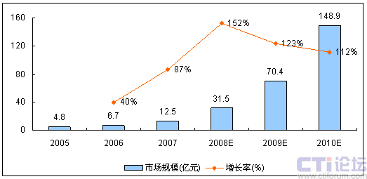 馳昂咨詢(Sinotes)發(fā)布的《2007-2008年中國移動增值業(yè)務市場研究年度報告》顯示,截止至2007年底,中國移動即時通信(IM)市場規(guī)模已經(jīng)達到12.5億元。而隨著3G時代的來臨,在電信運營商的積極推動下,國內(nèi)移動IM市場必將步入快速增長期,預計未來三年增長率都將在100%以上。CTI論壇編輯