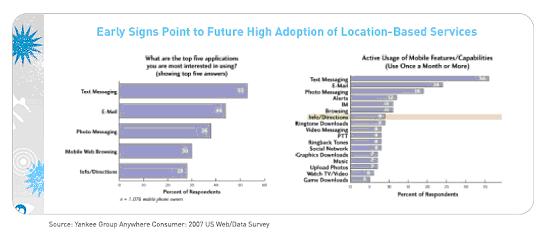 當(dāng)美國聯(lián)邦通信委員會(FCC)在2001年強(qiáng)制要求實施911增強(qiáng)功能時,移動行業(yè)就開始通過將導(dǎo)航服務(wù)引入大眾市場來獲利。7年后,絕大多數(shù)手機(jī)都集成了GPS功能,幾大主要的移動運(yùn)營商也都計劃在年內(nèi)推出至少一項基于GPS 的導(dǎo)航應(yīng)用。揚(yáng)基集團(tuán)認(rèn)為,2008年正在成為美位置服務(wù)的轉(zhuǎn)折點。