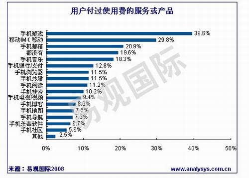 據(jù)易觀國(guó)際《中國(guó)手機(jī)應(yīng)用市場(chǎng)用戶調(diào)研報(bào)告2008》研究發(fā)現(xiàn),用戶付過(guò)使用費(fèi)的手機(jī)應(yīng)用服務(wù)及產(chǎn)品中,手機(jī)游戲、移動(dòng)IM和手機(jī)郵箱的比例較高。其中39.6%的手機(jī)應(yīng)用用戶付費(fèi)玩過(guò)手機(jī)游戲,29.8%的用戶曾經(jīng)為移動(dòng)IM付費(fèi),而手機(jī)郵箱的付費(fèi)用戶將達(dá)20%。其他手機(jī)應(yīng)用產(chǎn)品或服務(wù)中,付費(fèi)用戶的比例相當(dāng),均在10%左右,但是有近20%的用戶沒(méi)有用過(guò)任何的付費(fèi)服務(wù)或產(chǎn)品。易觀國(guó)際