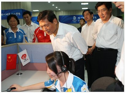 7月7日訊 今天上午,北京市委書記、北京奧組委主席劉淇,北京市市長、北京奧組委執(zhí)行主席郭金龍一行到北京奧運會觀眾呼叫中心視察。自7月1日--9月25日,奧運觀眾呼叫中心將為國內(nèi)外觀眾提供觀賽信息咨詢,并陸續(xù)開通多個語種服務(wù),其中,方言也納入了語音服務(wù)的范圍。奧運官方網(wǎng)站