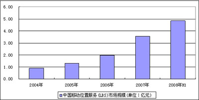 2008年上半年,LBS業(yè)界期盼已久的3G網(wǎng)絡(luò)終于進(jìn)入了試商用階段,盡管TD-SCDMA的試用過(guò)程中存在著諸多問(wèn)題,用戶感受不佳,但它畢竟為L(zhǎng)BS開(kāi)拓出一片廣袤的用戶市場(chǎng)。隨著中國(guó)移動(dòng)在TD方面的發(fā)力,以及電信重組之后, 3G牌照的發(fā)放,LBS市場(chǎng)必將呈現(xiàn)出高速發(fā)展之勢(shì)。圖 1 2003-2008年上半年中國(guó)移動(dòng)位置服務(wù)(LBS)市場(chǎng)規(guī)模