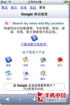 Google for iPhone的界面針對(duì)iPhone/ipod touch下的safari做了優(yōu)化,富客戶(hù)端在手持設(shè)備上,無(wú)論界面還是速度都達(dá)到近乎完美的地步。