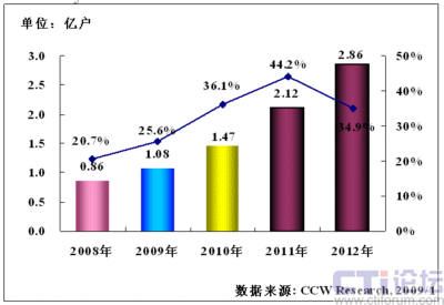 計世資訊(CCW Research)研究預(yù)測,2009年中國移動支付用戶數(shù)將達到1.08億戶,其同比增長率將達到25.6%,預(yù)計2010年中國移動支付用戶數(shù)將達到1.47億戶,其同比增長率將達到36.1%,2011年中國移動支付用戶數(shù)將達到2.12億戶,其同比增長率將達到44.2%,2012年中國移動支付用戶數(shù)將達到2.86億戶,其同比增長率將達到34.9%。