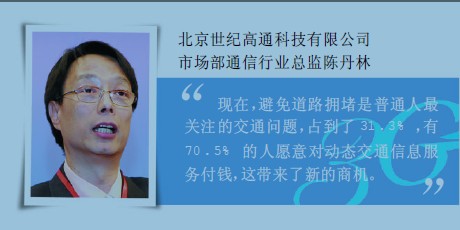 在北京世紀高通科技有限公司市場部通信行業(yè)總監(jiān)陳丹林看來,交通堵塞已經成為現(xiàn)代都市的頑疾,而3G的到來給這一問題的解決帶來了新的思路。通信產業(yè)網