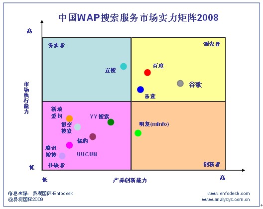 2008年WAP搜索市場中處于務(wù)實(shí)者象限的主要廠商是宜搜。2008年宜搜年收入占整個(gè)WAP搜索市場的36%。這主要?dú)w因于宜搜在整個(gè)2008年在市場推廣和營銷方面投入了大量的人力以及資金投入。