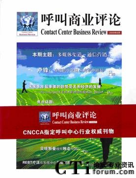 《呼叫商業(yè)評論》(Contact Center Business Review )是一本服務(wù)于呼叫中心行業(yè)企業(yè)高管人群的高端雜志,是CNCCA呼叫中心及客戶關(guān)系管理協(xié)會指定呼叫中心行業(yè)權(quán)威刊物,可作為高端客戶群體的行業(yè)指南,洞悉行業(yè)新舉措,法規(guī)新動態(tài)的風向標。
