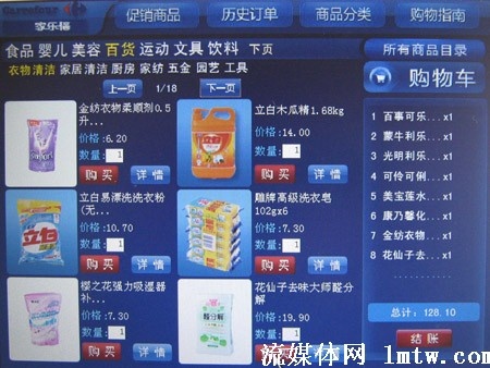 記者在家樂福IPTV購物平臺上看到,商品的種類相當(dāng)豐富,按日常用到的分成了食品、嬰兒、美容、百貨、運動、文具、飲料幾個大類,而每一類里又分成不同的小類,比如美容類里又分護膚、清潔、男士、彩妝、紙巾等小類。其價格與在家樂福購物相同,并且還有不少產(chǎn)品在打折。滿118元即可免費配送,對于沒有時間、精力逛超市的人來講,可以說相當(dāng)方便。