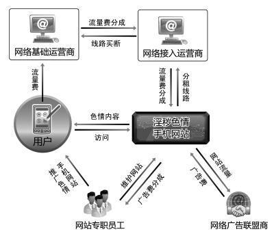 以包裝成彩鈴的標價2塊錢的淫穢色情視頻為例,用戶下載后,電信運營商就會從上網(wǎng)的手機賬號上扣掉2元錢,之后電信運營商就會按照與增值服務商的分成協(xié)議規(guī)定,按一定比例與增值服務商進行分成,比如按3:7進行分成,電信運營商就會將2元錢中的0.6元留為已有,將剩余的1.2元交給增值服務商,增值服務商再將1.2元中的一部分按比例分給內(nèi)容提供商。在這個過程中,電信運營商不僅獲得了增值服務分成的錢,而且由于提供了上網(wǎng)服務,還會從手機用戶那里收取下載彩鈴所需要的數(shù)據(jù)流量費。