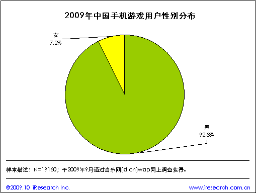 當(dāng)樂(lè)網(wǎng)調(diào)研數(shù)據(jù)顯示,2009年手機(jī)游戲用戶性別比例依然是男性居高。手機(jī)游戲用戶男性占比為92.8%,女性占比僅為7.2%。