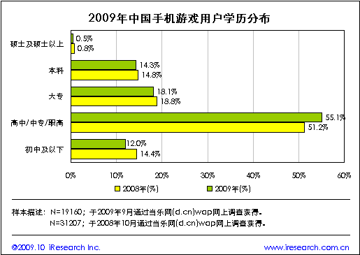 當(dāng)樂(lè)網(wǎng)調(diào)研數(shù)據(jù)顯示,2009年手機(jī)游戲用戶中高中(含中專、職高)部分的比例較2008年有所增長(zhǎng),增長(zhǎng)幅度達(dá)3.9個(gè)百分點(diǎn),其余各學(xué)歷階段的用戶比例則均出現(xiàn)不同程度的下降。