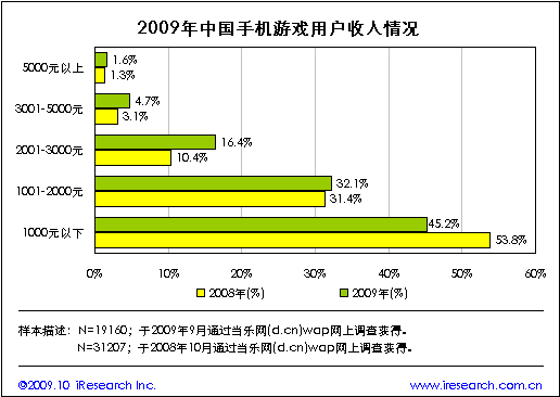 當(dāng)樂(lè)網(wǎng)調(diào)研數(shù)據(jù)顯示,2009年手機(jī)游戲用戶的月收入在1000~3000元之間的占比為48.5%,較2008年增長(zhǎng)6.7個(gè)百分點(diǎn)。收入高于2000元的中高收入用戶群體占22.7%,比2008年占比上升7.9個(gè)百分點(diǎn),收入在1000元以下的低收入群體占45.2%,比2008年占比減少8.6個(gè)百分點(diǎn)。與2008年對(duì)比,2009年手機(jī)游戲用戶的收入水平有明顯提高,用戶的消費(fèi)潛力有所增強(qiáng)。