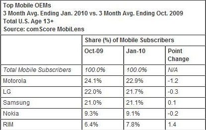 3月11日消息,據(jù)國外媒體報道,全球IT信息服務提供商comScore公司最近發(fā)布了一項2009年第四季度(2009年10月至2010年1月)美國手機市場調(diào)查報告。這份報告對手機原配件生產(chǎn)商(OEMs)及智能手機操作系統(tǒng)平臺做了相關(guān)的行業(yè)排名,排名依據(jù)為美國市場13歲以上手機用戶群數(shù)據(jù)的統(tǒng)計,以及用戶手機使用行為的調(diào)查數(shù)據(jù)。一月份報告顯示摩托羅拉以22.9%的市場份額占據(jù)了第一位。RIM公司則占據(jù)著智能手機市場43%的市場份額,競爭優(yōu)勢明顯。網(wǎng)易科技