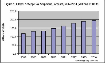 據(jù)iSuppli公司,機(jī)頂盒出貨量未來幾年將繼續(xù)增長。消費者收看模式發(fā)生轉(zhuǎn)變,通過互聯(lián)網(wǎng)提供的電視內(nèi)容越來越流行,從而將為提供商創(chuàng)造條件,在數(shù)字家庭的激烈爭奪中獲得新的營業(yè)收入來源。國際電子商情
