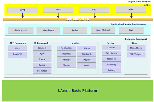 LARENA3.0是聯(lián)芯科技自主研發(fā)的高度可配置、可擴(kuò)展、開(kāi)放性的業(yè)內(nèi)主流手機(jī)應(yīng)用平臺(tái),它集通信、多媒體和移動(dòng)互聯(lián)網(wǎng)功能于一體,實(shí)現(xiàn)了完整的應(yīng)用生命周期管理和動(dòng)態(tài)加載能力,充分體現(xiàn)了TD-SCDMA特有創(chuàng)新技術(shù),并支持多種業(yè)務(wù)能力,提供豐富的工具套件。圖為TD-SCDMA手機(jī)應(yīng)用軟件平臺(tái)LARENA3.0架構(gòu)