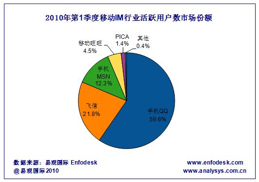 據(jù)易觀國(guó)際Enfodesk產(chǎn)業(yè)數(shù)據(jù)庫(kù)近期發(fā)布的《2010年第1季度中國(guó)市場(chǎng)移動(dòng)IM數(shù)據(jù)監(jiān)測(cè)報(bào)告》研究顯示:2010年第1季度中國(guó)市場(chǎng)移動(dòng)IM活躍用戶數(shù)環(huán)比增長(zhǎng)超過(guò)18%,總數(shù)突破1.6億,累計(jì)賬戶數(shù)環(huán)比增長(zhǎng)10.97%,總數(shù)超過(guò)3.8億,相比09年第4季度依然取得了較快的增長(zhǎng)。但是基于整體市場(chǎng)來(lái)看,移動(dòng)IM活躍用戶數(shù)市場(chǎng)格局并沒(méi)有發(fā)生太大變化,手機(jī)QQ仍然以59.6%的市占率名列市場(chǎng)第一,飛信、手機(jī)MSN位列二三名,具體市場(chǎng)占比及排名如下圖所示: