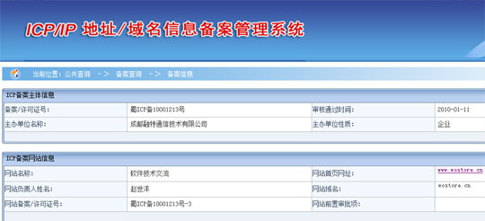 從目前看,WoStore相關域名可能同樣無法幸免,盡管目前wostore.cn已被用作中國聯(lián)通“WoStore應用商店”官網(wǎng)域名,并在版權區(qū)標注為“中國聯(lián)通版權所有”,但目前域名注冊商處信息仍然顯示,wostore.cn所有者為“成都融特通信技術有限公司”。工信部備案資料顯示, wostore.cn于今年1月11日通過審核備案,目前網(wǎng)站負責人同樣是成都融特通信技術有限公司。