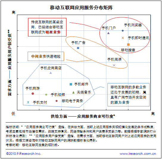 根據(jù)艾瑞咨詢近期發(fā)布的《2009-2010年中國移動互聯(lián)網(wǎng)行業(yè)發(fā)展報(bào)告》,移動互聯(lián)網(wǎng)各應(yīng)用服務(wù)在“應(yīng)用服務(wù)商業(yè)可行度”和“應(yīng)用服務(wù)用戶接受度”兩個(gè)維度上被劃分為“明星業(yè)務(wù)”、“中間業(yè)務(wù)”和“潛力業(yè)務(wù)”三個(gè)類型。具備一定規(guī);l(fā)展市場條件,但還面臨若干限制因素的移動互聯(lián)網(wǎng)業(yè)務(wù),將在未來逐步打開市場。
