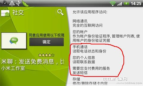 國內(nèi)外Kik類應(yīng)用也逐漸興起,騰迅最近也加入此陣營并推出其下產(chǎn)品微信。Kik類應(yīng)用主要以用戶手機(jī)中聯(lián)系人目錄為主要的關(guān)系抓取,只要其聯(lián)系人中裝入該客戶端,用戶無需特意添加即可開始類似短信的聊天。以KikMessenger為例,其中便涉及讀取用戶聯(lián)系人信息、電話狀態(tài)和身份等權(quán)限。