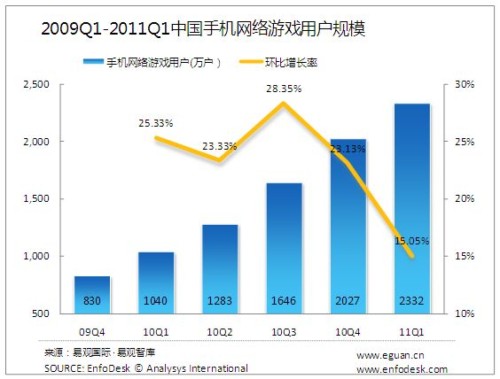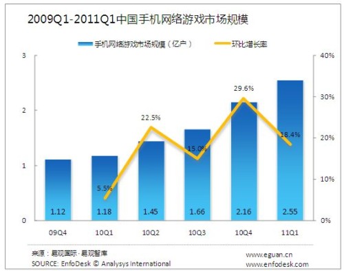 2011年第1季度中國手機網(wǎng)絡(luò)游戲市場規(guī)模達2.55億