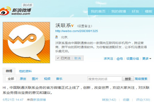 昨日下午,中國(guó)聯(lián)通“沃聯(lián)系”業(yè)務(wù)官方微博正式上線,而在稍后晚間,中國(guó)聯(lián)通官方微博也對(duì)此微博進(jìn)行推介,并稱(chēng)“中國(guó)聯(lián)通即將推出一款面向互聯(lián)網(wǎng)和手機(jī)用戶(hù),跨運(yùn)營(yíng)商、跨平臺(tái)的即時(shí)通信軟件‘沃聯(lián)系’。為幫助用戶(hù)朋友更好了解和使用這款即將上線的產(chǎn)品,中國(guó)聯(lián)通沃聯(lián)系產(chǎn)品組現(xiàn)已開(kāi)通@沃聯(lián)系新浪官方微博,敬請(qǐng)關(guān)注!