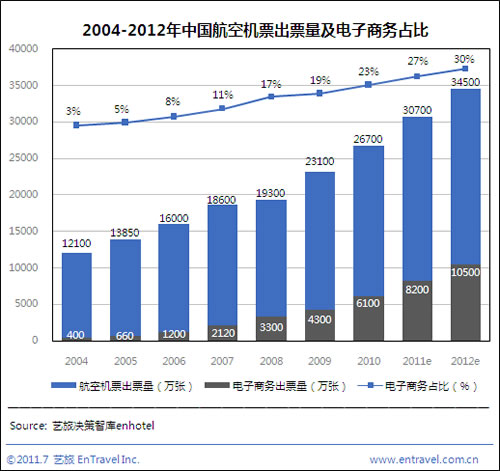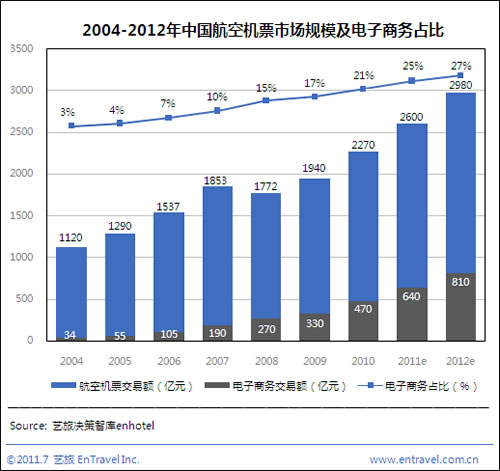 2011年上半年中國(guó)機(jī)票電子商務(wù)交易額達(dá)310億元,同期民航機(jī)票交易額為1250億元,電子商務(wù)占比升至25%,距美國(guó)45%的滲透率仍有差距。預(yù)計(jì)2011全年中國(guó)航空機(jī)票電子商務(wù)交易額將達(dá)640億元,而民航機(jī)票交易額將達(dá)2600億元。藝旅咨詢