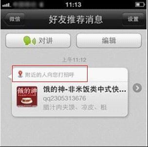 最近,網(wǎng)絡(luò)上流傳著這樣一幅截圖:一家叫“餓的神”的快餐店在午間向附近的人打招呼,以宣傳自己的快餐生意,乍一看這種形式,簡直是超越了空間的電子傳單啊?磥砦⑿胚@種交友利器,已經(jīng)突破了傳統(tǒng)交流工具的定義,開始向更寬的領(lǐng)域延伸。