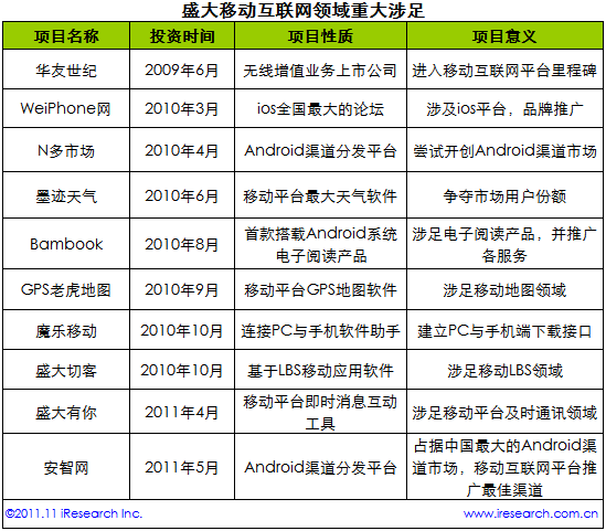 根據(jù)艾瑞咨詢整理的數(shù)據(jù)認為,盛大一向秉持這“產業(yè)布局比產品開發(fā)更重要”的想法,縱觀盛大在幾年中對移動互聯(lián)網(wǎng)的產業(yè)鏈建立,投資及開發(fā)項目可謂是星光奪目。