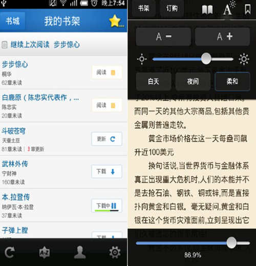 書(shū)架部分就是擺放所有你下載的和購(gòu)買(mǎi)的書(shū)籍的地方,在這里如果你在看的電子書(shū)有新章節(jié)更新,它會(huì)在書(shū)架中提示你。閱讀界面支持白天、夜間和柔和三種閱讀模式,適合不同時(shí)段閱讀。但是根據(jù)馬勇的介紹,調(diào)整字體的技術(shù)才是這里最大的特點(diǎn),當(dāng)你調(diào)整字體時(shí),相應(yīng)段落之間的間距也會(huì)對(duì)應(yīng)調(diào)整,不會(huì)出現(xiàn)字體變小后文章段落間距很大的問(wèn)題。