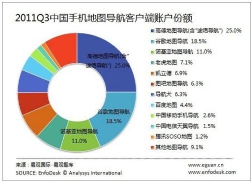 CTI論壇(ctiforum)11月3日消息(記者 潘婷婷): 綜合EnfoDesk易觀智庫產(chǎn)業(yè)數(shù)據(jù)庫《2011年第3季度中國手機地圖客戶端市場監(jiān)測報告》和《2011年第3季度中國手機導航客戶端市場監(jiān)測報告》數(shù)據(jù),高德軟件、谷歌及諾基亞分別占據(jù)中國手機地圖導航客戶端用戶市場前三名的位置(中國"手機地圖客戶端+手機導航客戶端"的整體市場份額)。CTI論壇報道