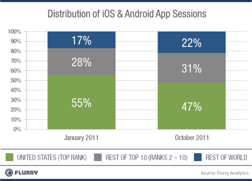使用iOS和Android設(shè)備和其他新技術(shù)一樣,最早開始于可支配收入較高的北美和西歐地區(qū)。然而,隨著型號較舊的iOS產(chǎn)品價格下降,以及Android設(shè)備的生產(chǎn)商提供了更多大家買得起的低價設(shè)備,包括新興市場在內(nèi)的國際市場的消費者越來越多。下圖顯示了移動應(yīng)用下載如何擴(kuò)張到美國之外。