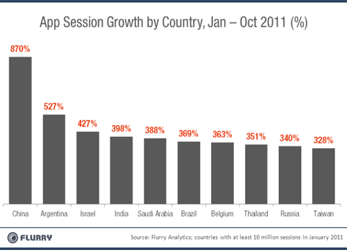 圖:2011年1至10月移動應(yīng)用下載增速最快的十個國家