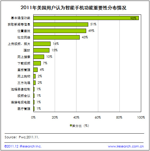艾瑞咨詢根據(jù)Pwc近日發(fā)布的美國(guó)移動(dòng)互聯(lián)網(wǎng)用戶演變研究報(bào)告發(fā)現(xiàn),用戶對(duì)移動(dòng)設(shè)備的使用和依賴程度增強(qiáng),同時(shí),通過(guò)對(duì)用戶使用智能手機(jī)功能的調(diào)查發(fā)現(xiàn),用戶認(rèn)為最重要的功能主要集中在基本通信、獲取資訊信息、位置查找和社交網(wǎng)絡(luò)上。艾瑞咨詢