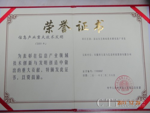 CTI論壇(ctiforum)1月4日消息(記者 潘婷婷):12月29日,工業(yè)和信息化部主辦的2011年第十一屆信息產業(yè)重大技術發(fā)明評選結果發(fā)布會在京召開,科大訊飛、中興通訊等單位共5個項目以其在信息產業(yè)領域技術創(chuàng)新和發(fā)明創(chuàng)造中所做出的重大貢獻,榮獲國家信息產業(yè)最高榮譽--“信息產業(yè)重大技術發(fā)明獎”。CTI論壇報道