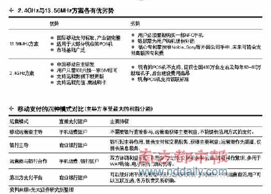 對此,國金證券發(fā)布了一份研究報告稱,相對于13 .56MHz方案而言,2.4GHz方案在推廣上有先天的優(yōu)勢。畢竟13.56M H z方案必須對手機重新設(shè)計,需要等待手機產(chǎn)業(yè)鏈對13.56M H z的逐步支持,時間周期較長;同時,更換13.56M H z手機帶來的重置成本無論是由用戶承擔還是由運營商承擔都是一筆高額的費用,推廣難度較高。而2.4G H z方案僅需更換SIM卡便可完成對手機的改造,不用等待終端產(chǎn)業(yè)鏈的成熟;同時改造成本低,便于運營商進行促銷推廣。