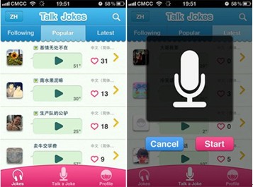 Talk Jokes是一款輕量級(jí)語(yǔ)音笑話(huà)分享應(yīng)用,鼓勵(lì)用戶(hù)通過(guò)真人錄音的方式上傳和分享自己的笑話(huà),專(zhuān)注于“講笑話(huà)”的這部分語(yǔ)音垂直市場(chǎng)。