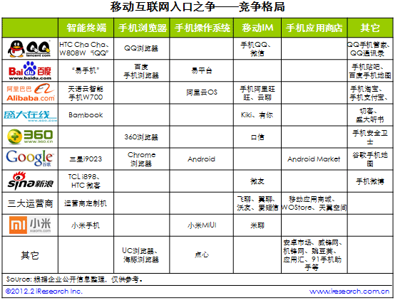 2011年,移動(dòng)互聯(lián)網(wǎng)領(lǐng)域發(fā)展熱度很高,競(jìng)爭(zhēng)激烈。艾瑞咨詢(xún)整理發(fā)現(xiàn),移動(dòng)端的“用戶(hù)入口”成為傳統(tǒng)互聯(lián)網(wǎng)巨頭、移動(dòng)運(yùn)營(yíng)商和移動(dòng)互聯(lián)網(wǎng)企業(yè)競(jìng)爭(zhēng)的聚焦點(diǎn)。這充分體現(xiàn)出,第一,移動(dòng)互聯(lián)網(wǎng)的發(fā)展前景好,第二,移動(dòng)互聯(lián)網(wǎng)目前仍處在用戶(hù)積累和行為培養(yǎng)的過(guò)程。