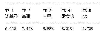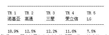 第一階段;湯森路透將每一項專利同歐洲電信標(biāo)準(zhǔn)協(xié)會截至2011年11月18日的LTE規(guī)范進(jìn)行比較,確定專利的重要性。第二階段涉及先有技術(shù)檢查,即審查在美國和歐洲申請專利過程中的先有技術(shù)參考文獻(xiàn)。湯森路透利用先有技術(shù)參考文獻(xiàn)評估每項專利的新穎性并給出新穎性評級。湯森路透發(fā)現(xiàn),擁有屬于LTE標(biāo)準(zhǔn)范疇的基本與新穎專利的領(lǐng)先廠商有諾基亞、高通、三星、愛立信和LG。結(jié)果如下: