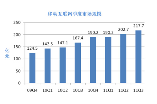 上圖是易觀國(guó)際發(fā)布的移動(dòng)互聯(lián)網(wǎng)的相關(guān)數(shù)據(jù),數(shù)據(jù)截止到2011年第三季度,該圖顯示,2009年全球經(jīng)濟(jì)復(fù)蘇之后,移動(dòng)互聯(lián)網(wǎng)業(yè)務(wù)收入一直保持著良好的增長(zhǎng)狀態(tài),最新數(shù)據(jù)表明,2011年移動(dòng)互聯(lián)網(wǎng)的整體市場(chǎng)規(guī)模已達(dá)到851億,遠(yuǎn)超過(guò)2010年的637億,增長(zhǎng)率將近33.6%,在移動(dòng)互聯(lián)網(wǎng)業(yè)務(wù)子領(lǐng)域中,表現(xiàn)最突出的是移動(dòng)電子商務(wù),與2009年相比較,移動(dòng)電子商務(wù)所占比例由3%直線(xiàn)增長(zhǎng)到11%。但是在手機(jī)閱讀和手機(jī)游戲方面則表現(xiàn)平平,有較大的增長(zhǎng)空間。預(yù)計(jì)2012年3G用戶(hù)規(guī)模將增長(zhǎng)到6億,將會(huì)超過(guò)互聯(lián)網(wǎng)用戶(hù)數(shù)量,智能機(jī)以及移動(dòng)互聯(lián)網(wǎng)還會(huì)保持或者超過(guò)2011年的增長(zhǎng)速率。